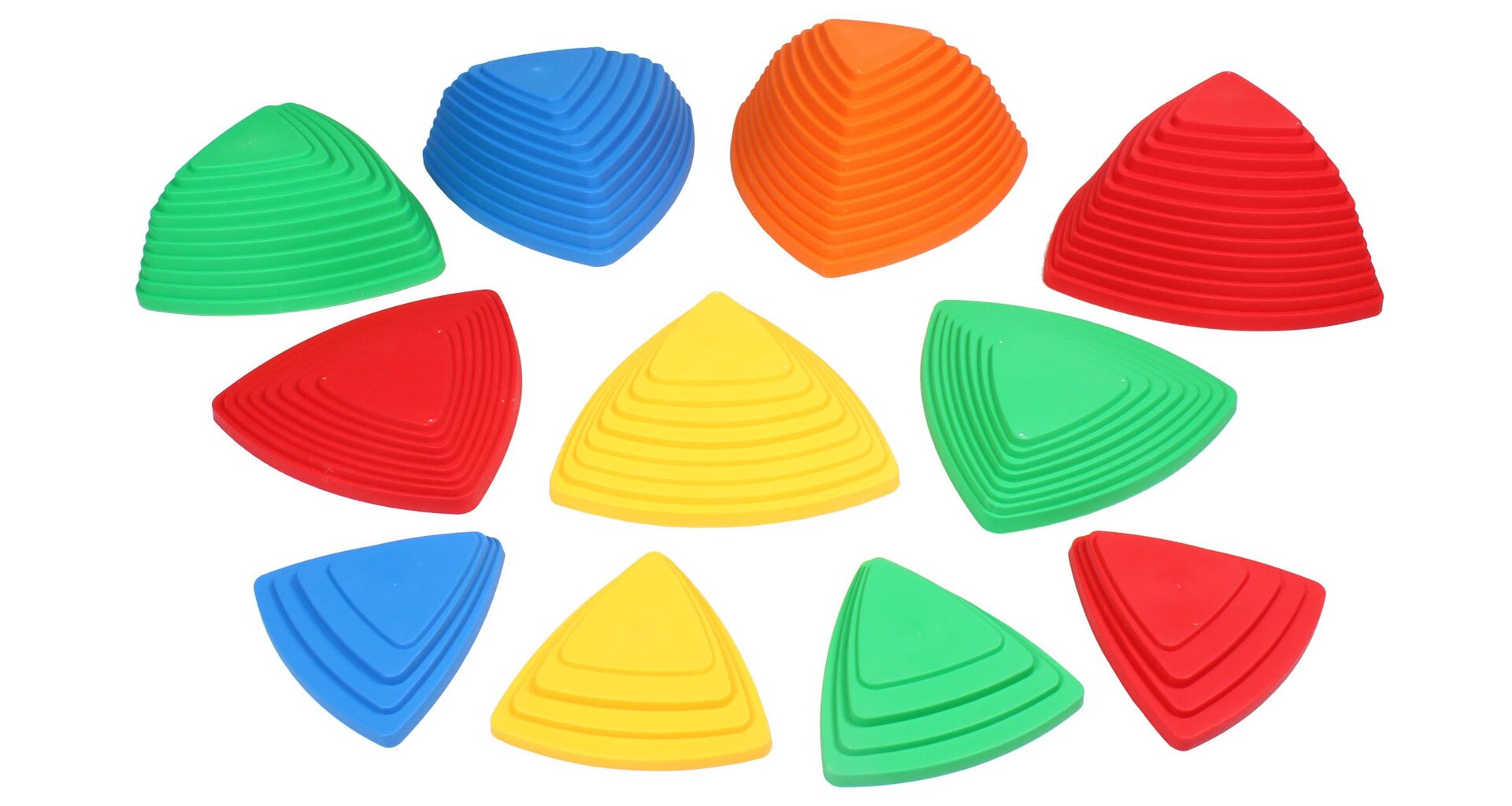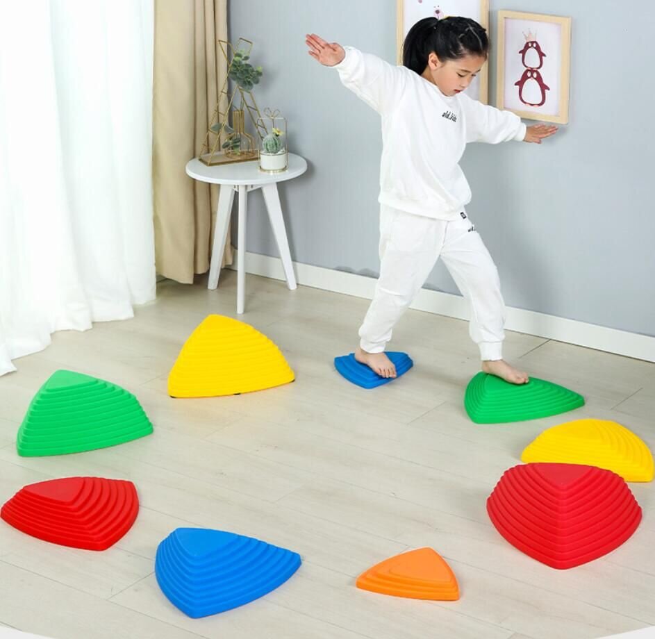 11 kolmnurgakujulisest tasakaalukivide komplekt võimaldab lastel ehitada lõbusa raja, mida nad saavad mänguliselt kasutada oma koordinatsioonioskuste, tasakaalu ja ruumilise orientatsiooni treenimiseks. Neljas suuruses ja viies värvitoonis olevad kivid on varustatud libisemiskindlate mattidega, mis tagavad nende stabiilsuse.